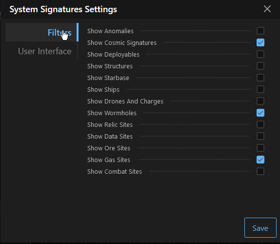 • Under Filters you should have at least the ‘Show Cosmic Signatures’ and ‘Show Wormholes’ checked. All of the others are optional but having too many will make the widget difficult to read.